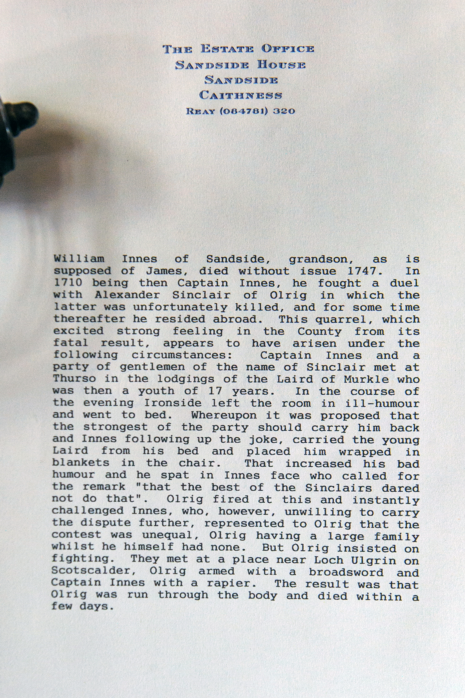 One of the earliest Lairds of Sandside was William Innes who was factor to Lord Forbes who obtained Sandside in 1626. William was succeeded by his son, James Innes the 2nd Laird of Sandside who was the member of parliament for Caithness. James was married to Elizabeth Johnstone, daughter of Arthur Johnstone MD the Royal Physician to King James the VI and 1st and to King Charles. Within the old church yard in Reay there is a carved armorial stone to James and Elizabeth Innes of Sandside showing the arms of Innes conjoined to the arms of Johnstone with a latin inscription from The Book of Job.